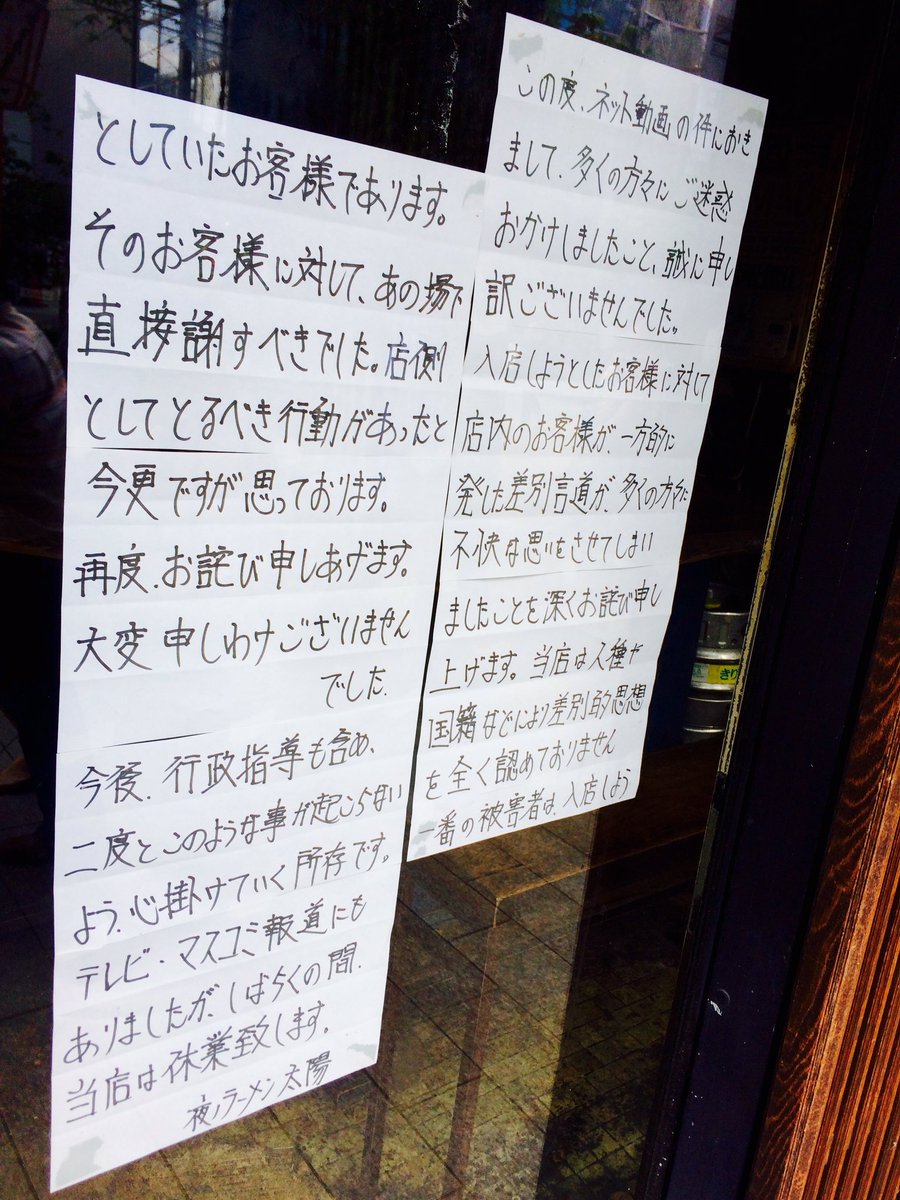 「ファッキン・コリアン」と発言したのは店員ではなく中にいた客なのだが、店まで巻き込まれる形に。店の前には張り紙がしてあり、「多くの方々にご迷惑おかけしましたこと、誠に申し訳御座いませんでした。